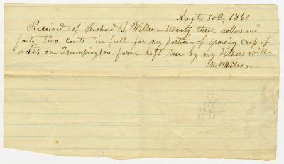 Receipt from R. B. Willson to M. N. Willson for $23.42 in part of oats crops left in their father's will