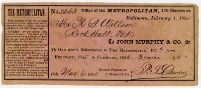 Receipt from John Murphy & Co. for subscription to "The Metropolitan"