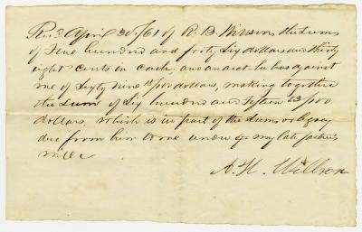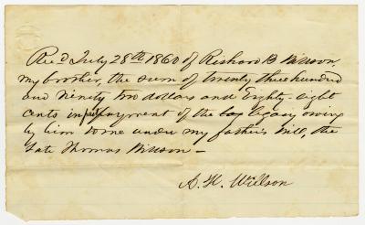 Receipt from A. H. Willson, for $2392.88, legacy from their father, paid by R. B. Willson