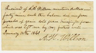 Receipt from A. H. Willson for portion of grain left in their father's will, $19.49 paid by R. B. Willson