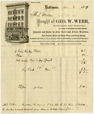Receipt from George Webb for gold hunting watch and chain paid by Martha Neale Willson