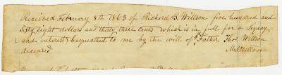 Receipt from M. N. Willson, for $568.33, in full for legacy from their father, paid by R. B. Willson