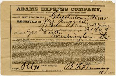 Receipt from Adams Express Co. to Jas. Ringgold for box marked George Deeth, Washington D.C.
